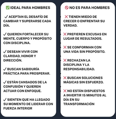 Tendrás una guía paso a paso para transformar tu postura como hombre en solo unos días. Nuestro material te ayudará a tomar las decisiones correctas, a controlar tu lado emocional y a tener claridad sobre cómo actúa un verdadero hombre.